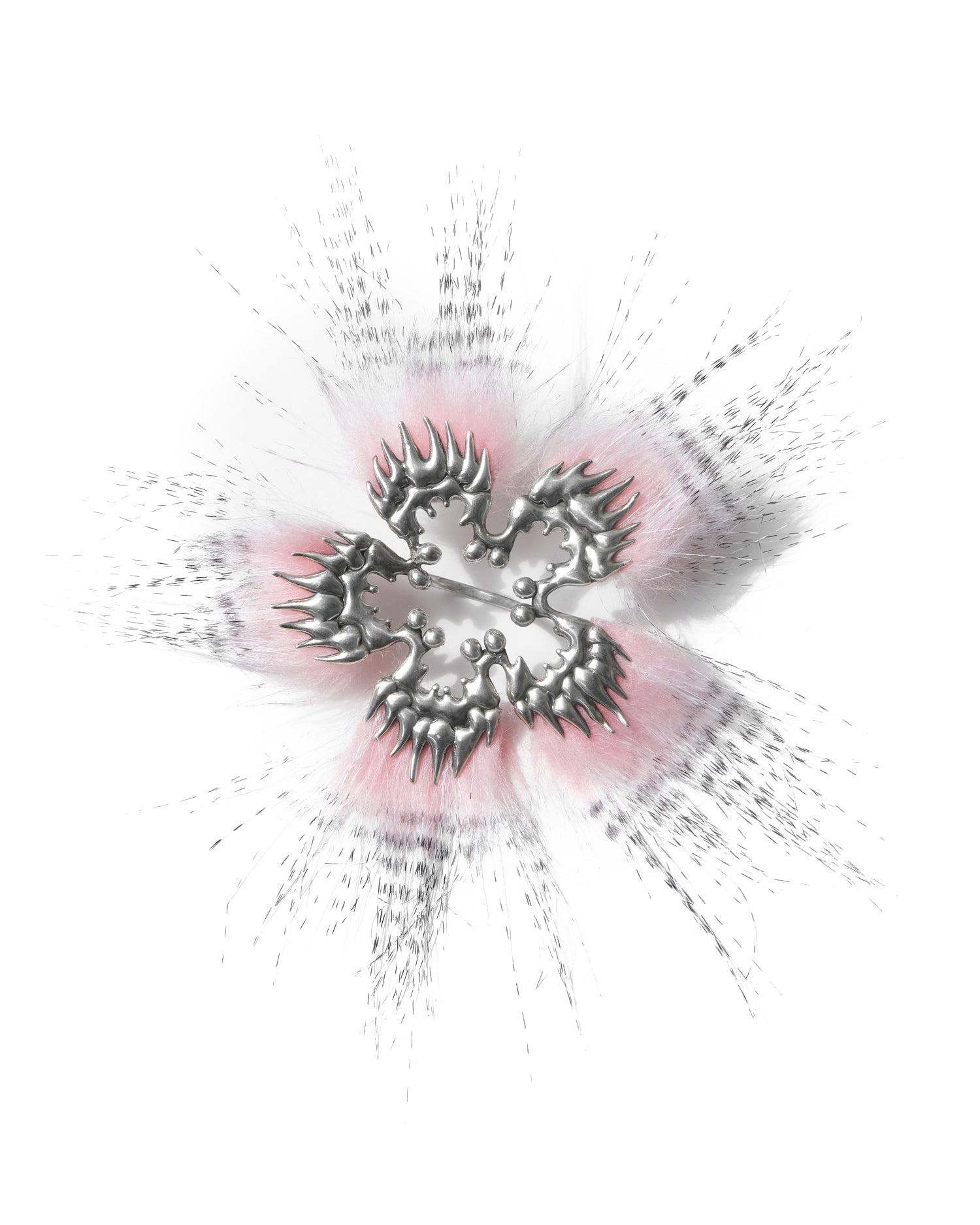 A hyptnotizing delicate flower ring composed of silver sterling petals adorned with intricately gradient textile.